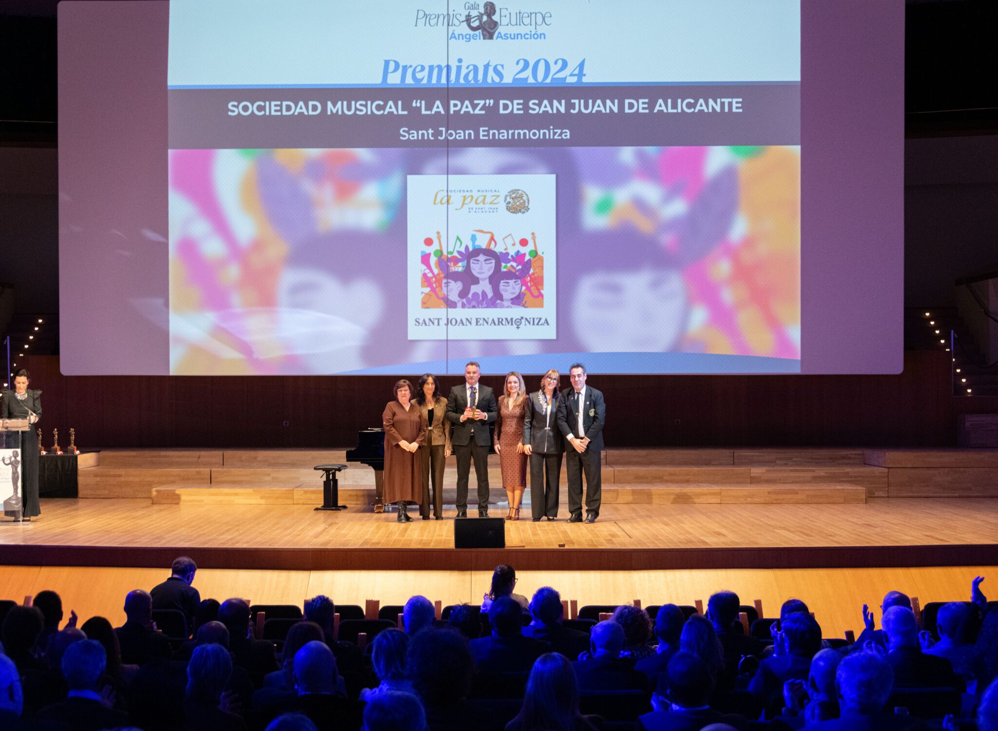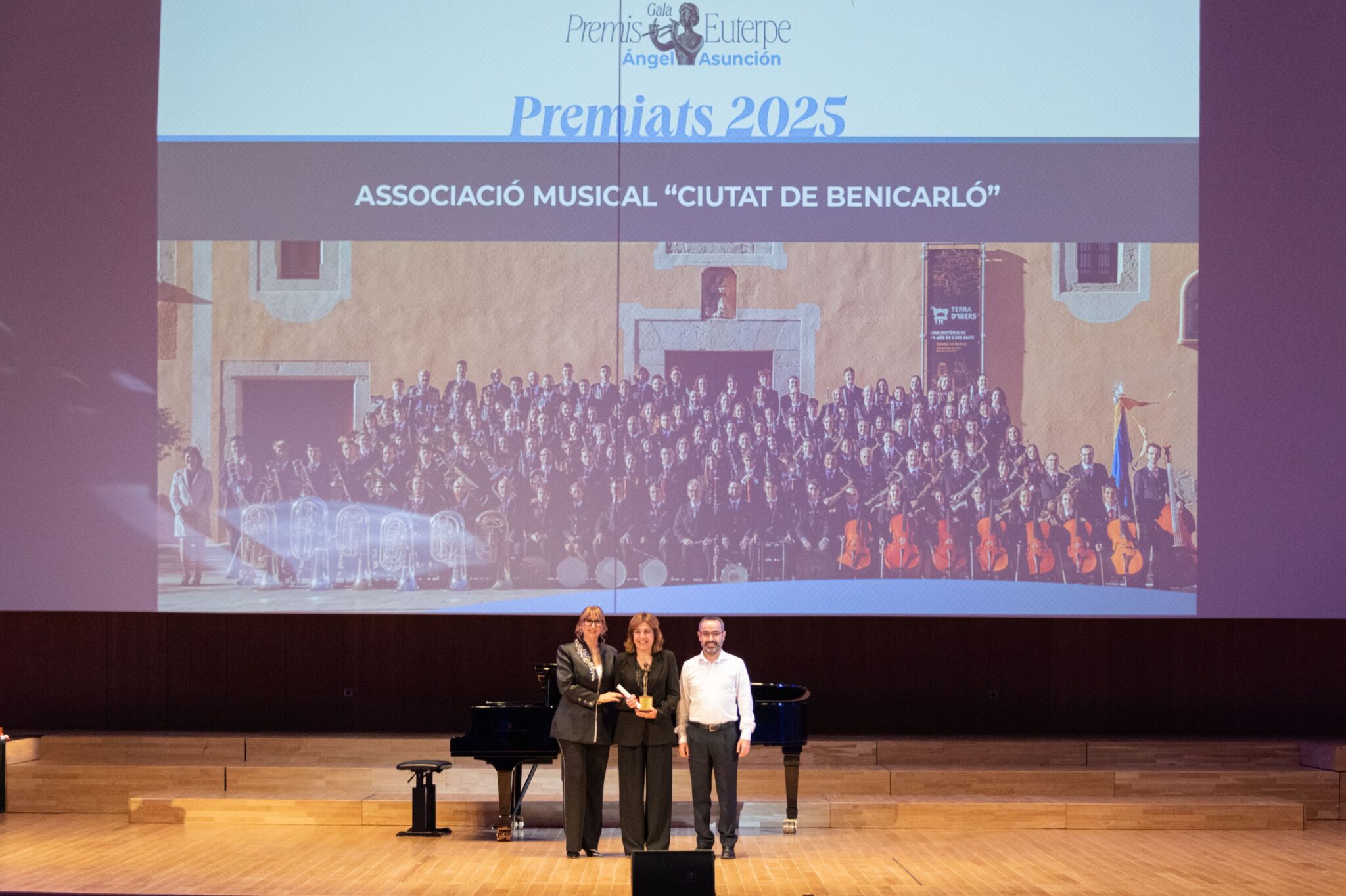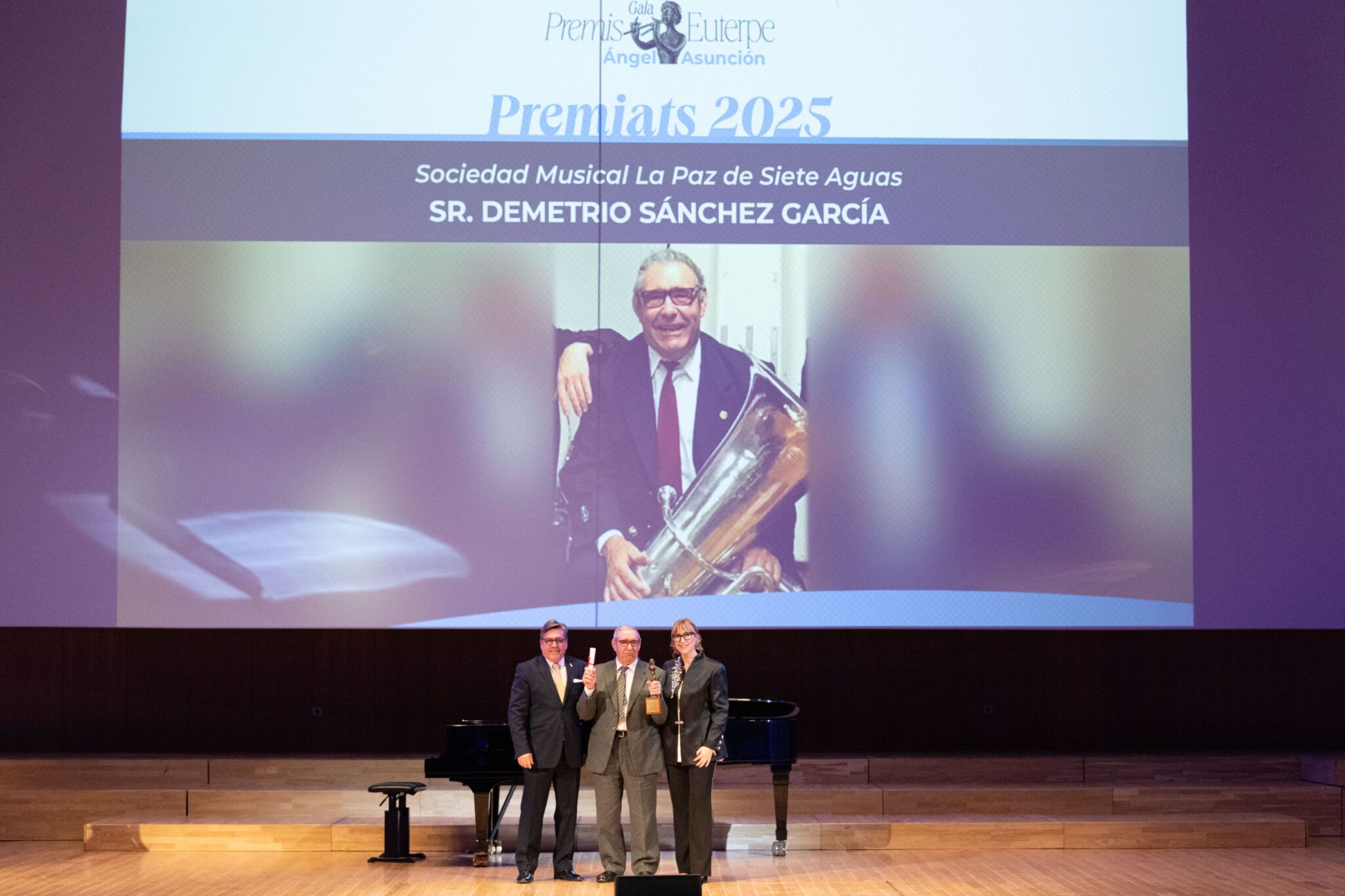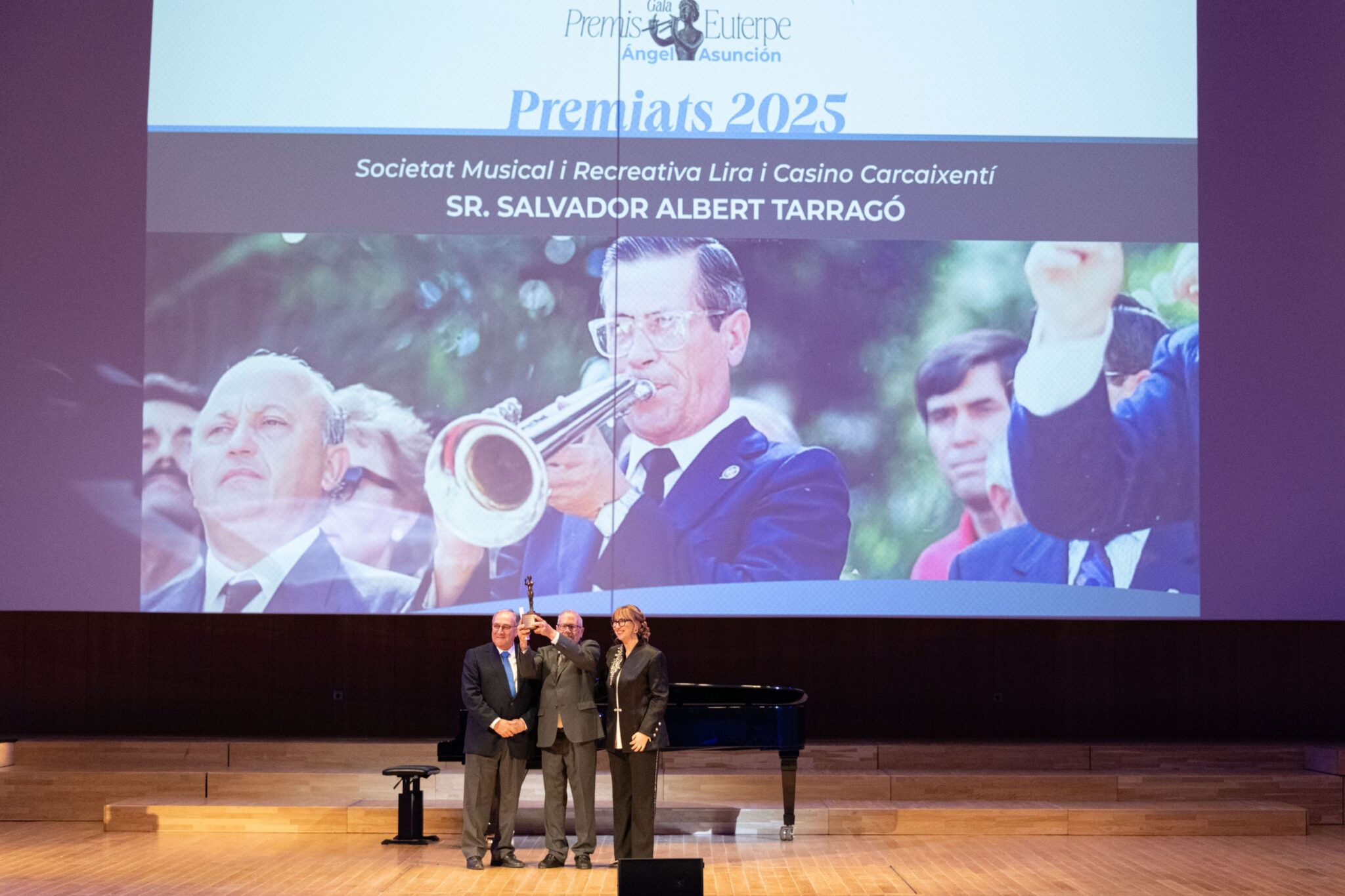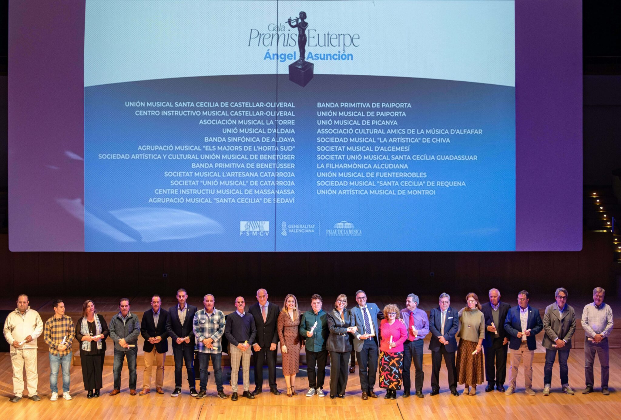 La Federación de Sociedades Musicales de la Comunidad Valenciana (FSMCV) celebró el pasado miércoles 26 de noviembre la gala de los Premios Euterpe – Ángel Asunción, que por primera vez tuvo lugar en el emblemático espacio del Palau de la Música de València. Esta edición tenía un valor especialmente simbólico: tras la suspensión de la gala prevista en 2024 debido a la DANA, la ceremonia ha reunido los premios correspondientes a 2024 y 2025, coincidiendo con la recuperación del XXV aniversario de los galardones.